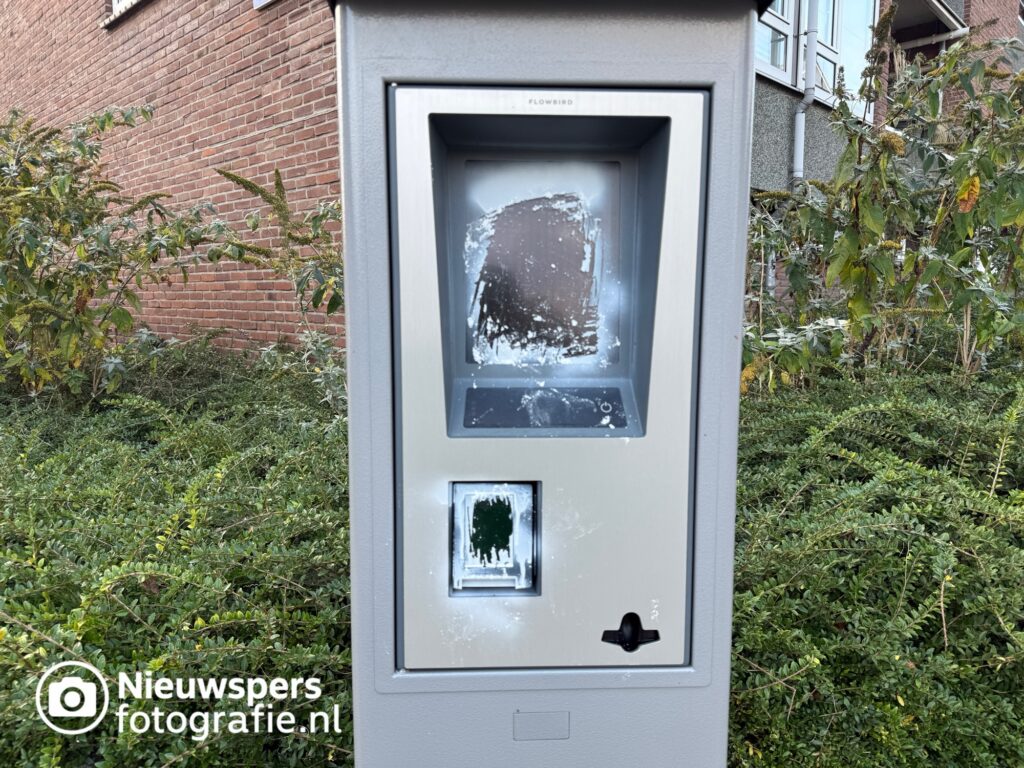AMERSFOORT – Aan de De Houtmanstraat, ter hoogte van de kruising met de Van Spilbergenstraat, is een splinternieuwe parkeerautomaat beklad met verf. Op de voorkant van de automaat is witte verf gesmeerd, waardoor het scherm en de bedieningsknoppen nauwelijks nog te gebruiken zijn.